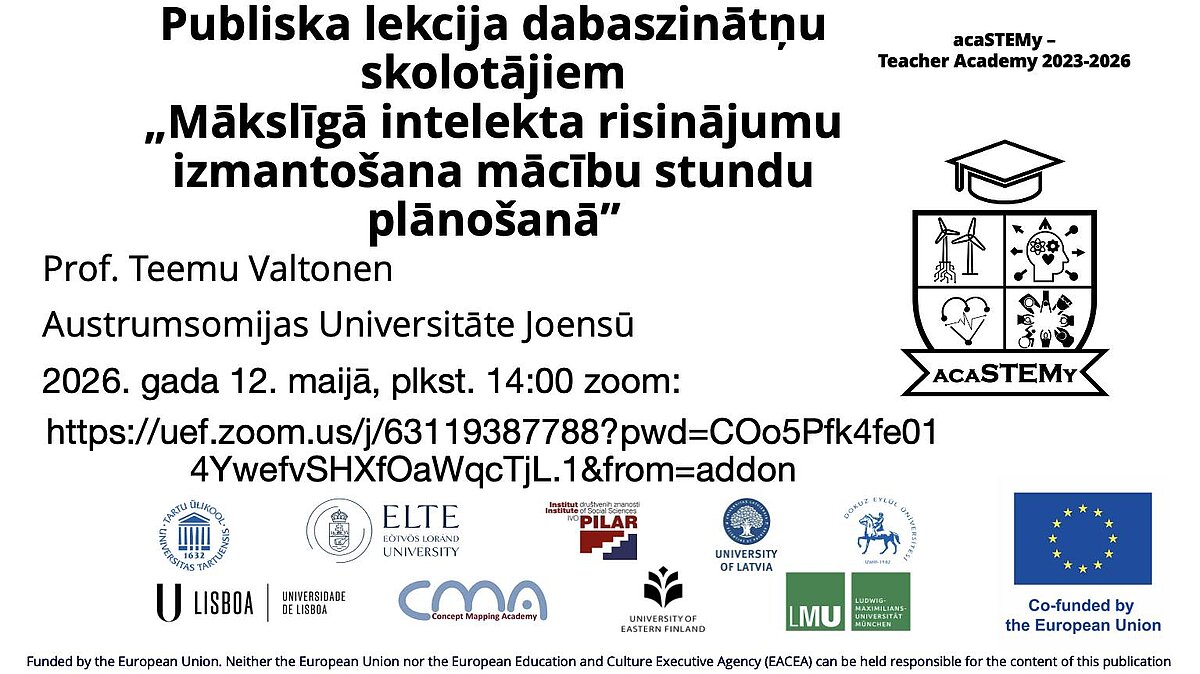 Austrumsomijas Universitātes (Joensū, Somija) profesora Teemu Valtonen un pētnieka Dr. Lais Oliveira Leite lekcija "Mākslīgā intelekta risinājumu izmantošana mācību stundu plānošanā" notiks 2026. gada 12. maijā, no plkst. 14.00 līdz 15.00 Zoom platformā.
